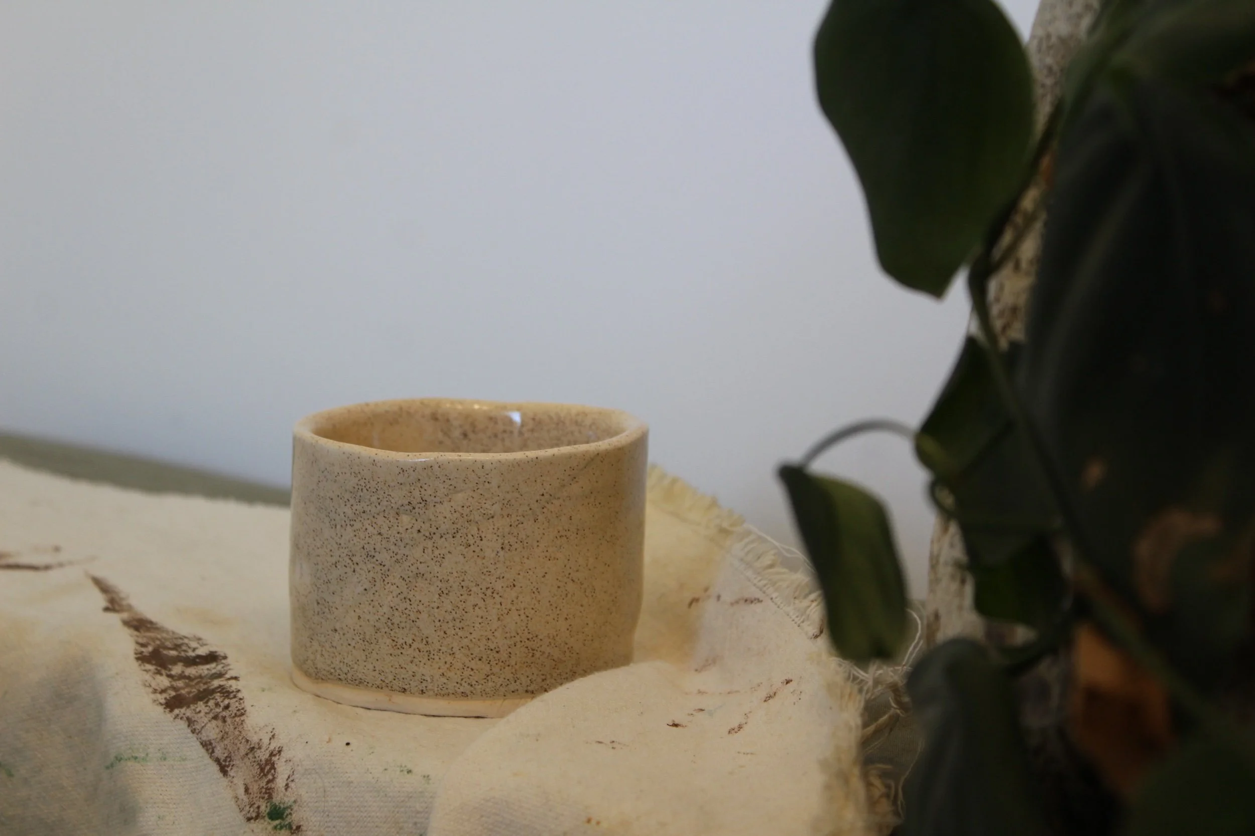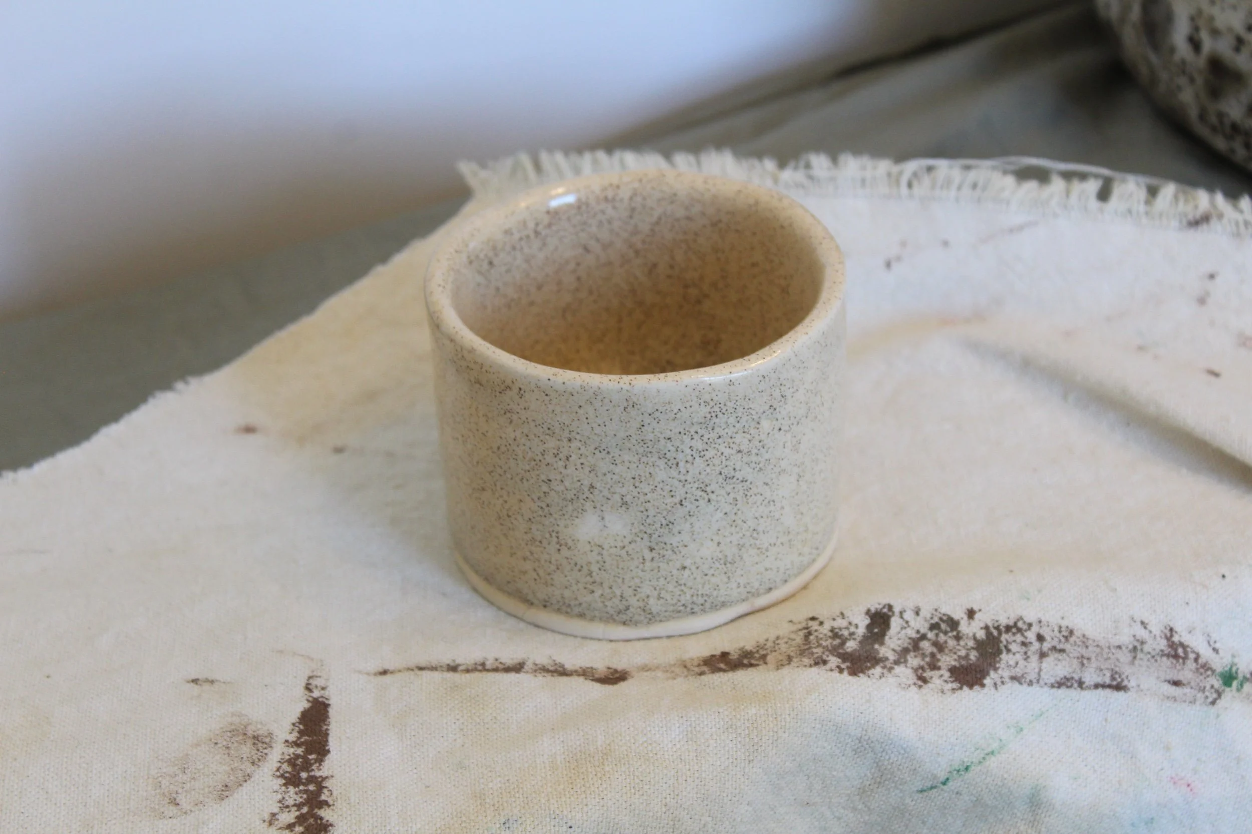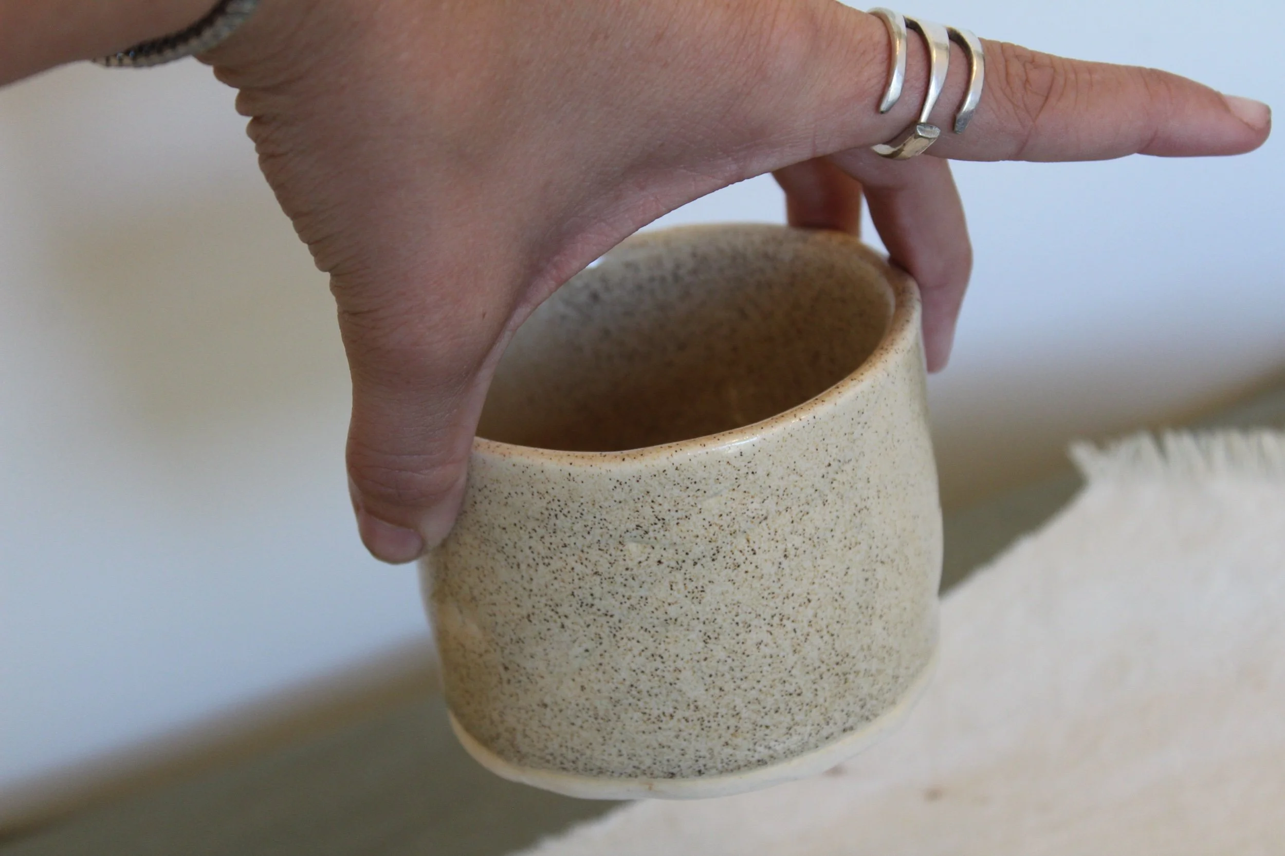 this is a no-handle ceramic mug. it is a cute way to enjoy your coffee or tea!